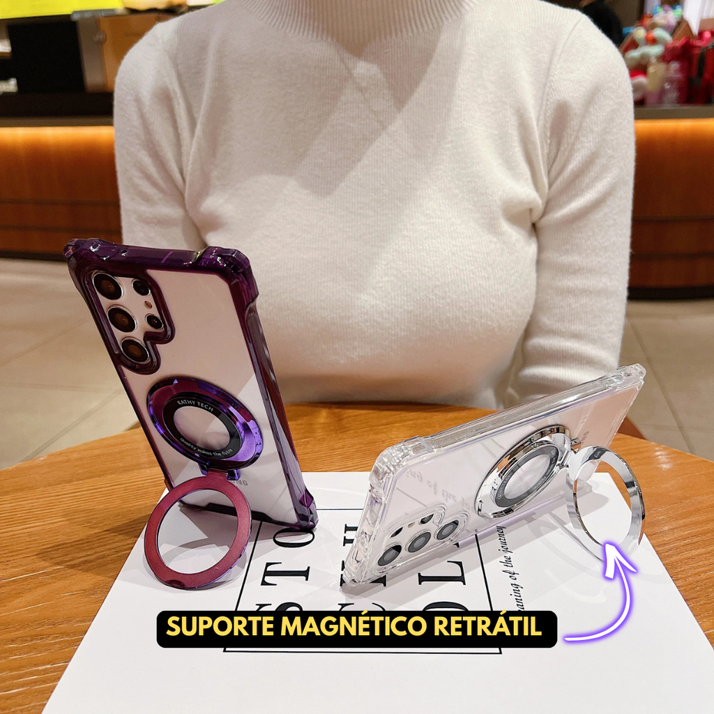 ✔ Suporte Metálico Integrado – O anel de suporte gira até 150°, garantindo conforto ao segurar e possibilitando o uso em suportes magnéticos, como os de carro. Além disso, não interfere no carregamento por indução.